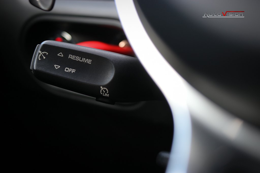 Snygg grå metallic kulör (Vulcano Grey) som gör sig riktigt bra tillsammans med inredningen i Läder/ Alcantara med röda bälten & sömmar.
